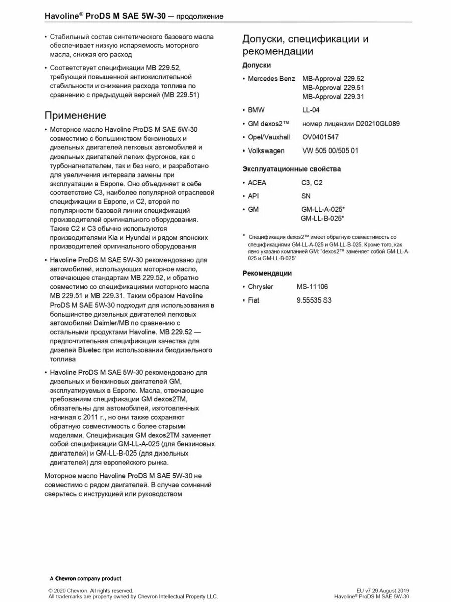 Мм синт. Havoline ProDS M 5W-30 4л, ACEA C3,C2,API SN,GM Dexos 2(GM-LL-A-025,GM-LL-B-025),BMW Longl, TEXACO 804036MHE (1 шт.)