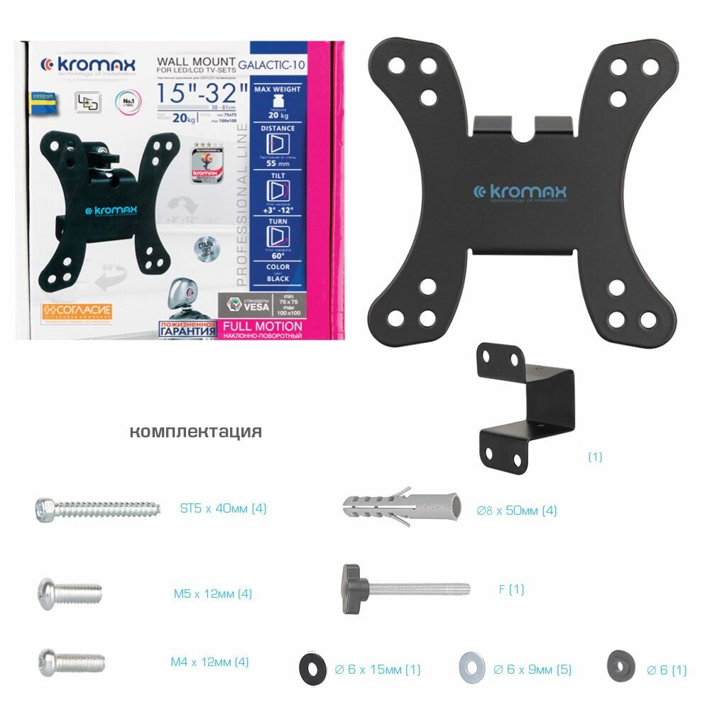 Кронштейны для техники Kromax Кронштейн настенный Kromax GALACTIC-10 15-32" (наклон -3°/+12°, поворот 60°, до 20 кг, черный)