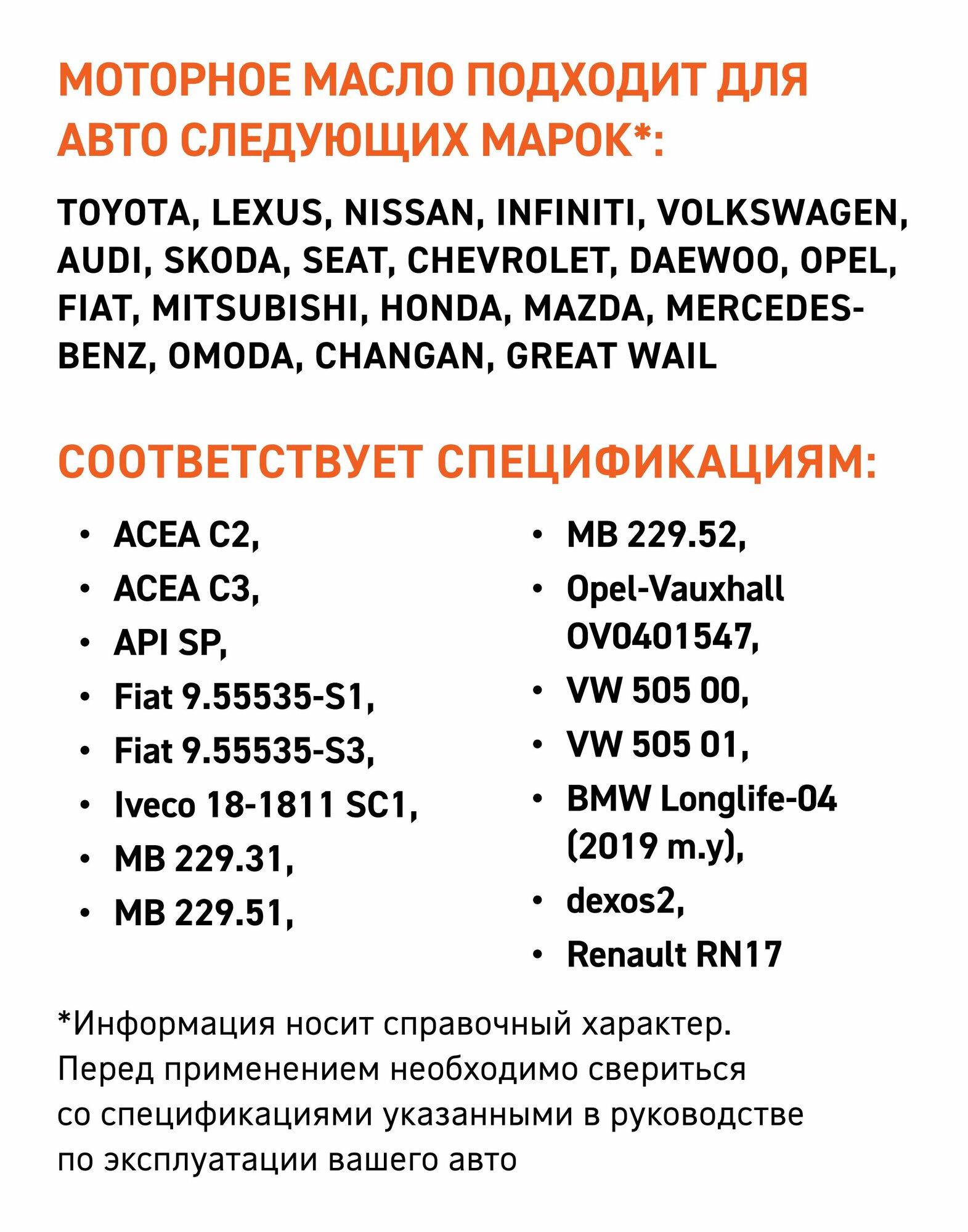 | Допуски OEM | BMW Longlife-04 / GM Dexos 2 / Iveco / MB 229.31 / MB 229.51 / MB 229.52 / Opel OV0401547 / VW 505.00 / VW 505.01 |