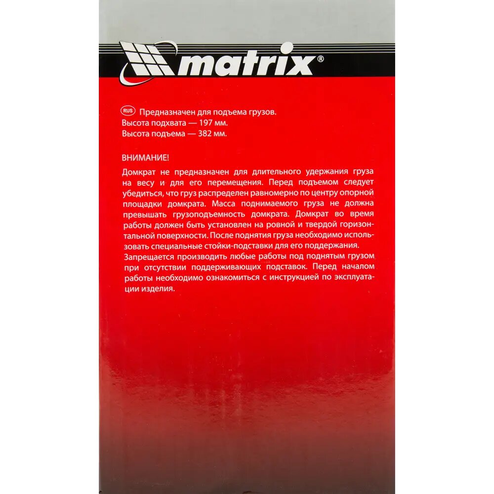 Домкрат гидравлический бутылочный, 5 т, h подъема 197-382 мм Matrix ( 50764 )
