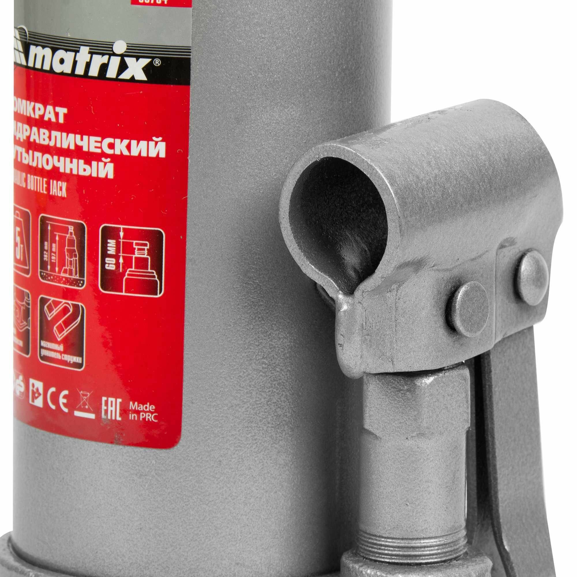 домкрат гидравлический бутылочный, 5 т, h подъема 197-382 мм matrix 50764 matrix 50764