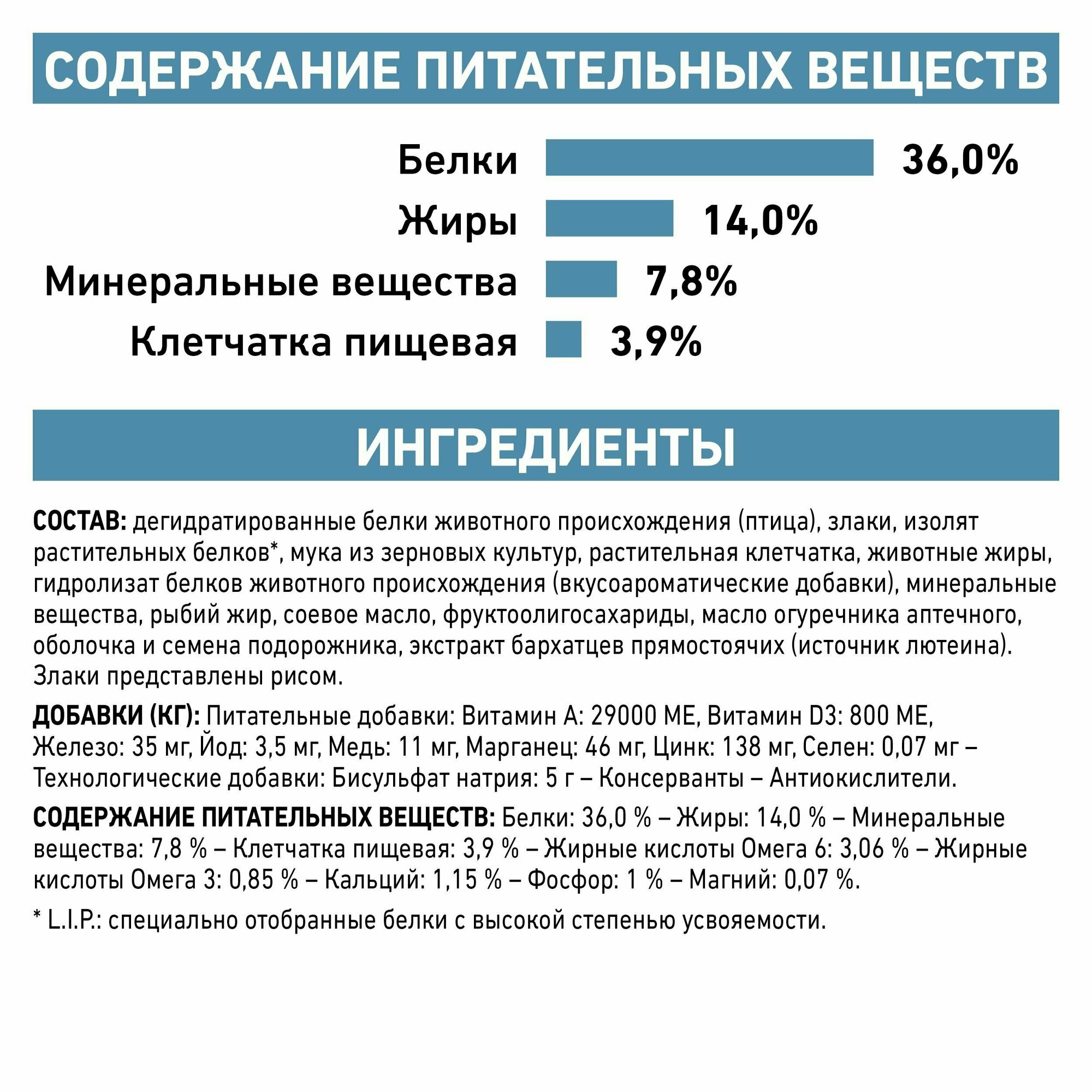 | Дополнительная информация | 1. Барьерная функция кожи Формула помогает поддерживать естественный защитный барьер кожи. 2. Здоровье кожи и шерсти Содержит особые нутриенты, включая EPA и DHA, которые помогают поддерживать здоровье кожи и блеск шерсти у кошек с чувствительной кожей. 3. Поддержание мышечной массы Высокое содержание белка помогает поддерживать мышечную массу. |