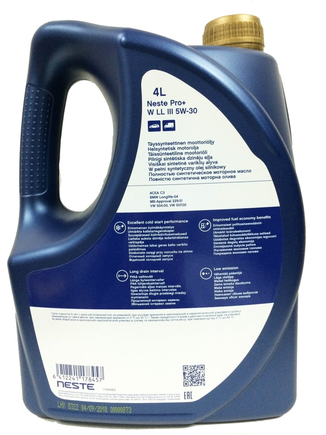 Синтетическое моторное масло Neste Pro+ W LL-III 5W-30, 4 л