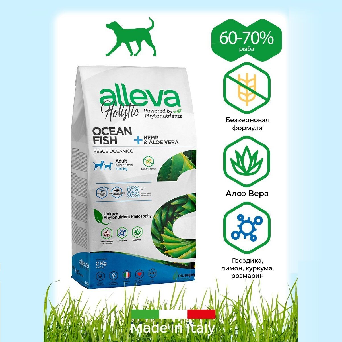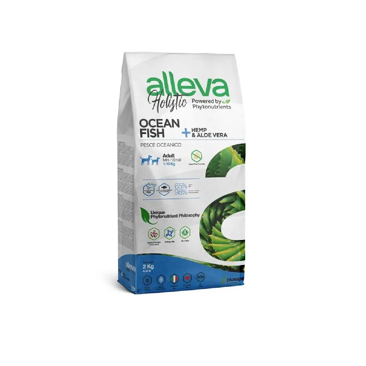 ALLEVA HOLISTIC ADULT DOG MINI OCEAN FISH беззерновой для взрослых собак маленьких пород с океанической рыбой, коноплей и алоэ вера (2 + 2 кг)