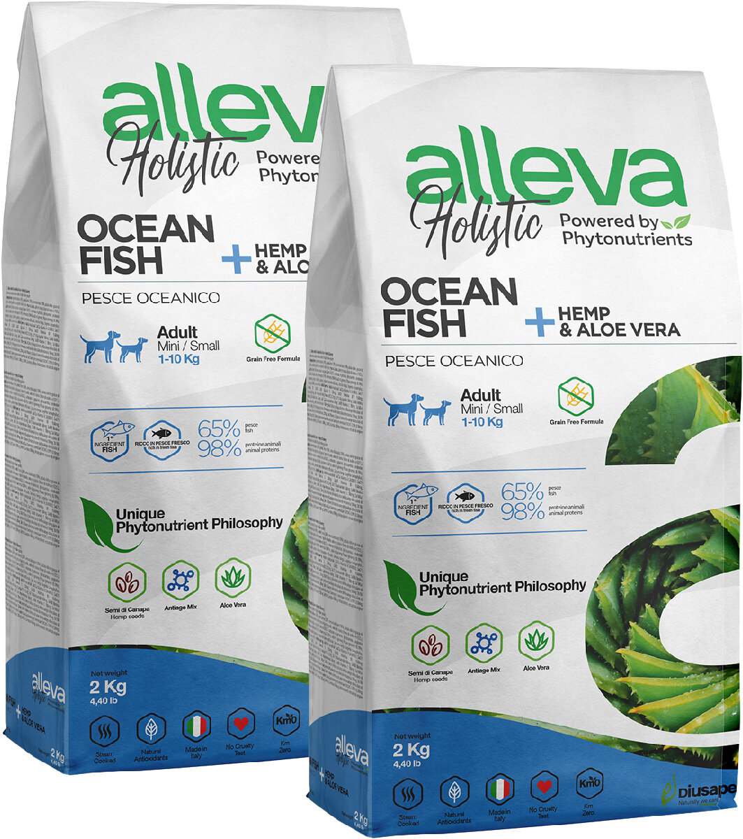 Купить ALLEVA HOLISTIC ADULT DOG MINI OCEAN FISH беззерновой для взрослых собак маленьких пород с океанической рыбой, коноплей и алоэ вера (2 + 2 кг)