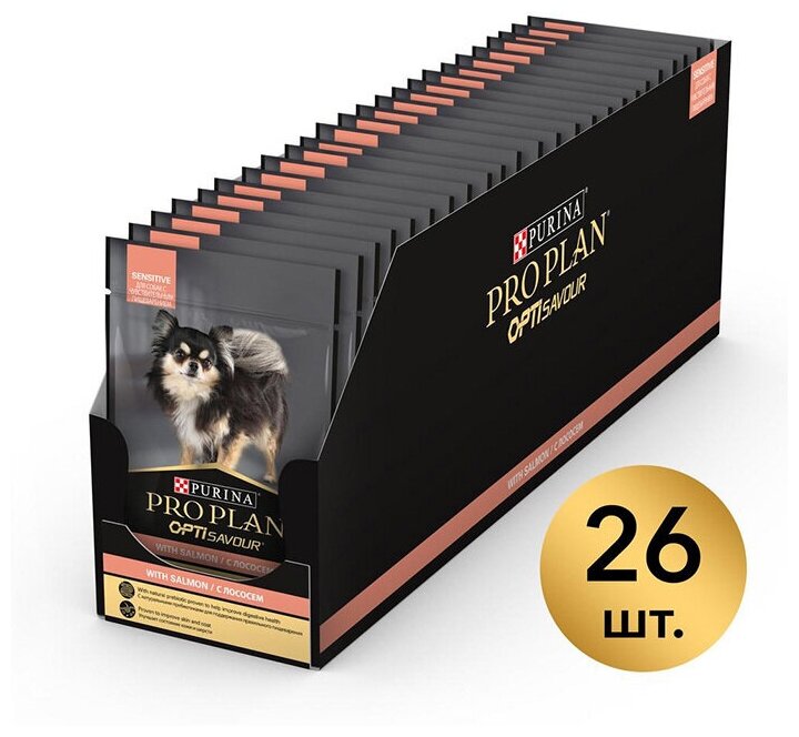 Купить Корм PRO PLAN Sensitive Digestion OPTI SAVOUR (комплекс с высокой вкусовой привлекательностью) (в соусе) для собак малых пород с чувствительным пищеварением, с лососем, 85 г x 26 шт