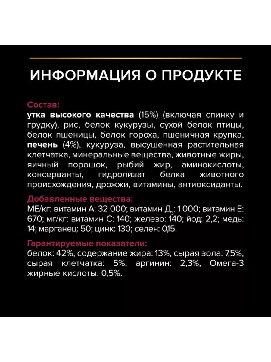 | Состав | утка (14%), рис, кукурузный глютен, сухой белок птицы, пшеничный глютен, концентрат белка гороха, пшеничная крупка, печень (4%), кукуруза, клетчатка, минеральные вещества, животный жир, яичный порошок, рыбий жир, консерванты, гидролизат белков животного происхождения, дрожжи, аминокислоты, витамины, антиоксиданты |