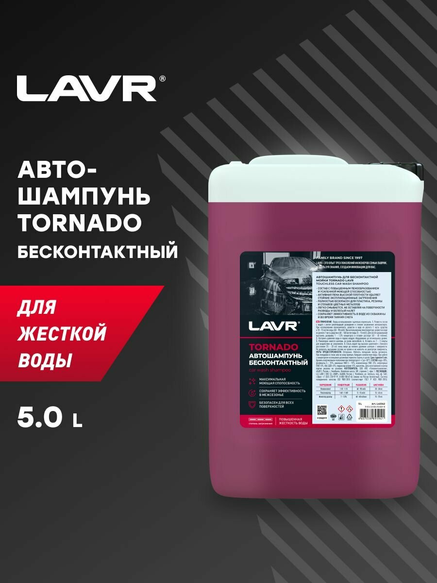 Автошампунь Lavr Tornado, для бесконтактной мойки, концентрат, моющая активность 9.8, для жёсткой воды, канистра 5л, арт. Ln2342