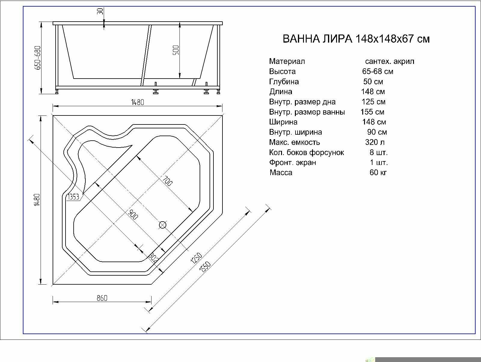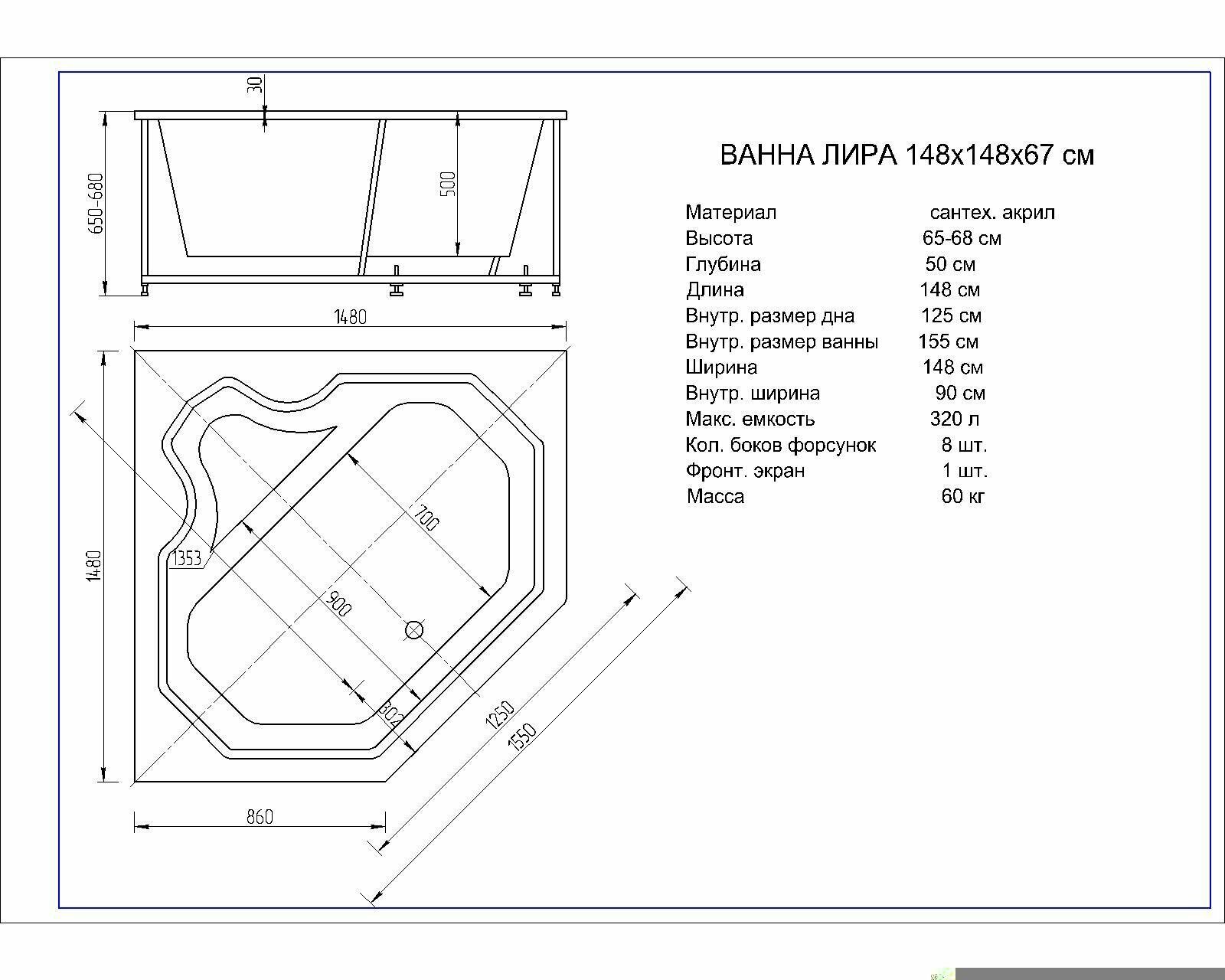 | Дополнительная информация | в комплекте: ванна, вклеенный каркас, фронтальный экран, слив-перелив |