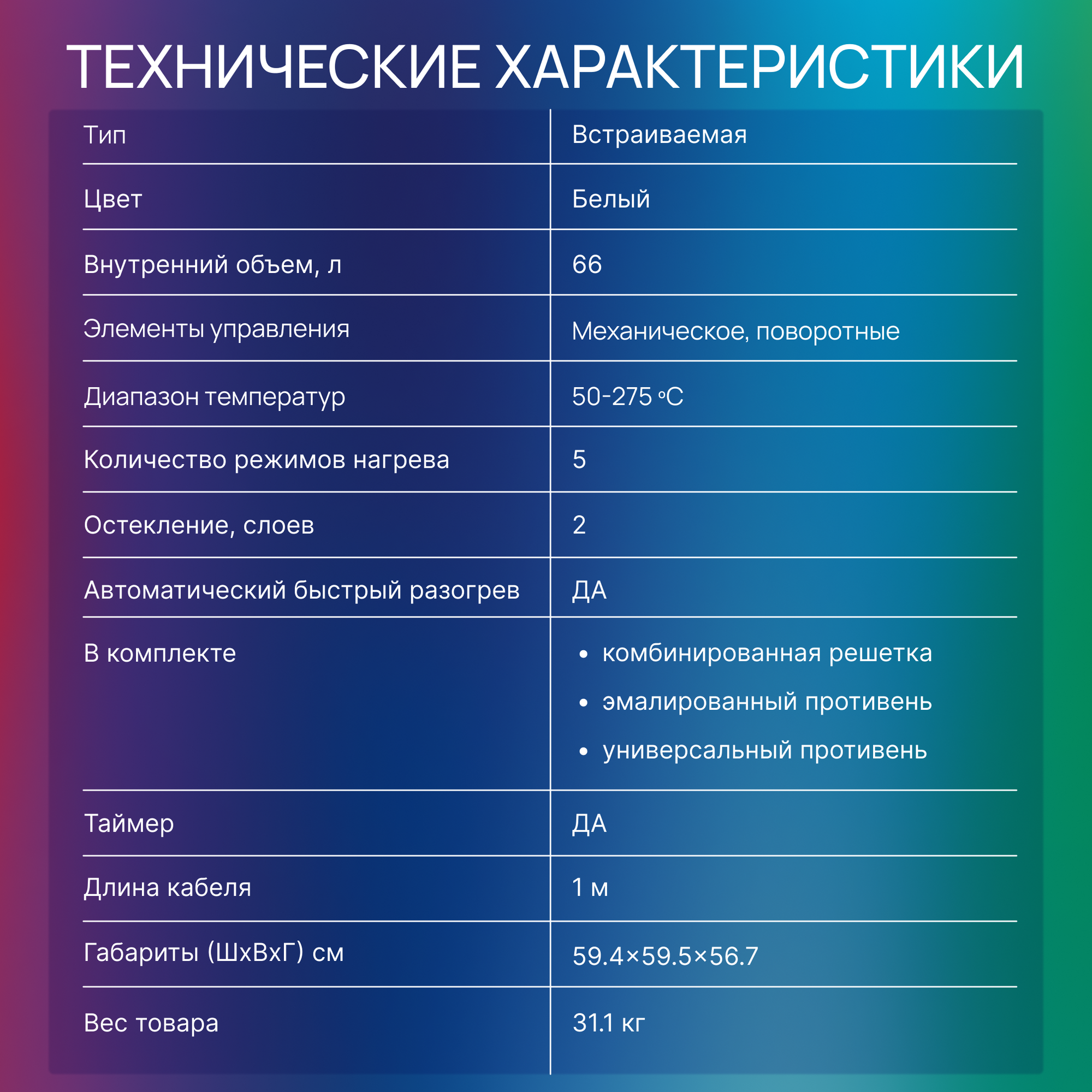 | Объем духовки | 66 л |