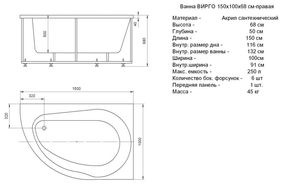 Ванна акриловая Акватек вирго правая, 150х100 фронтальная панель, каркас, слив интересное: