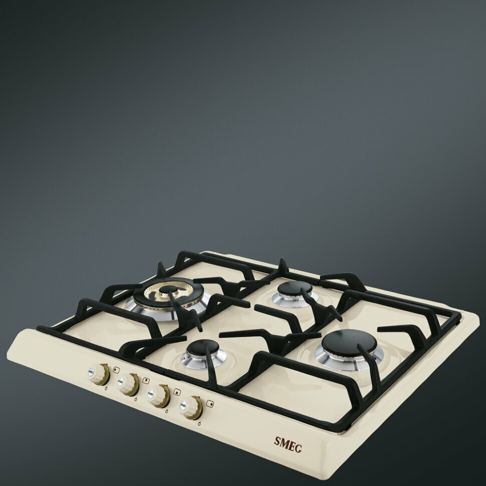 Встраиваемые газовые панели SMEG/ Газ, CORTINA,газовая варочная панель, 60 см,кремовый/ фурнитура латунь