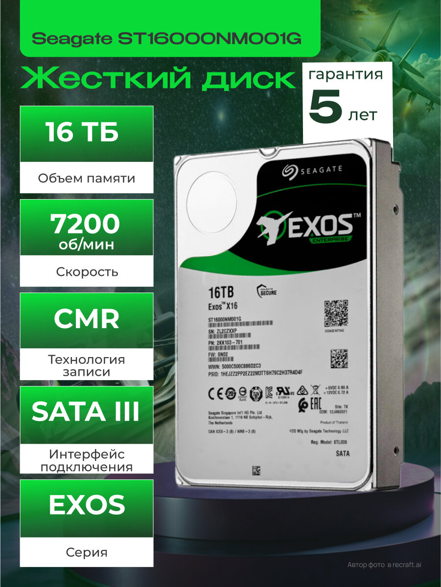 Жесткий диск HDD SATA Seagate 16Tb, ST16000NM001G, Exos X16, 7200 rpm, 256Mb buffer, 1 year