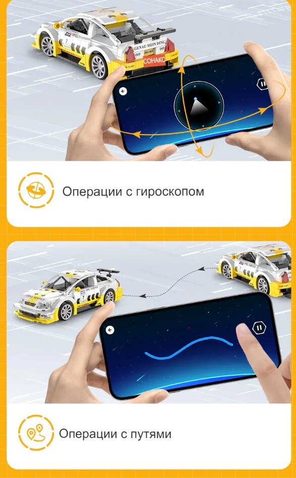 | Дополнительная информация | два режима дистанционного управления: программирование движения через мобильное устройство (с мобильным устройством машинка связывается по средствам Bluetooth), при помощи пульта управления 2,4 ГГц; подвижные элементы: двери, капот; датчики: гироскоп |