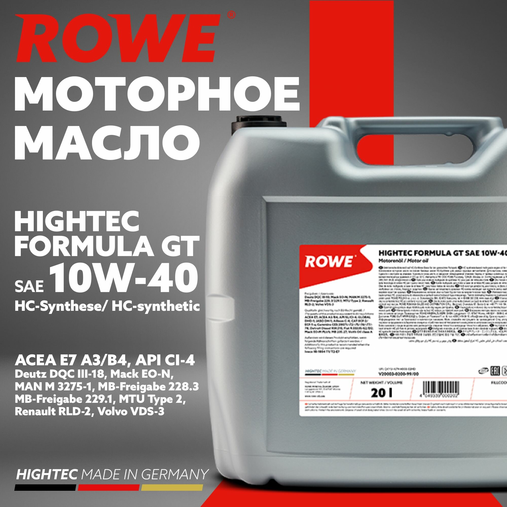 Купить ROWE 20003-0200-99 ROWE HIGHTEC FORMULA GT SAE 10W-40 HC (20л.)ACEA E7, ACEA A3/B4, API CI-4, GLOBAL DHD-1, JASO DH-1
