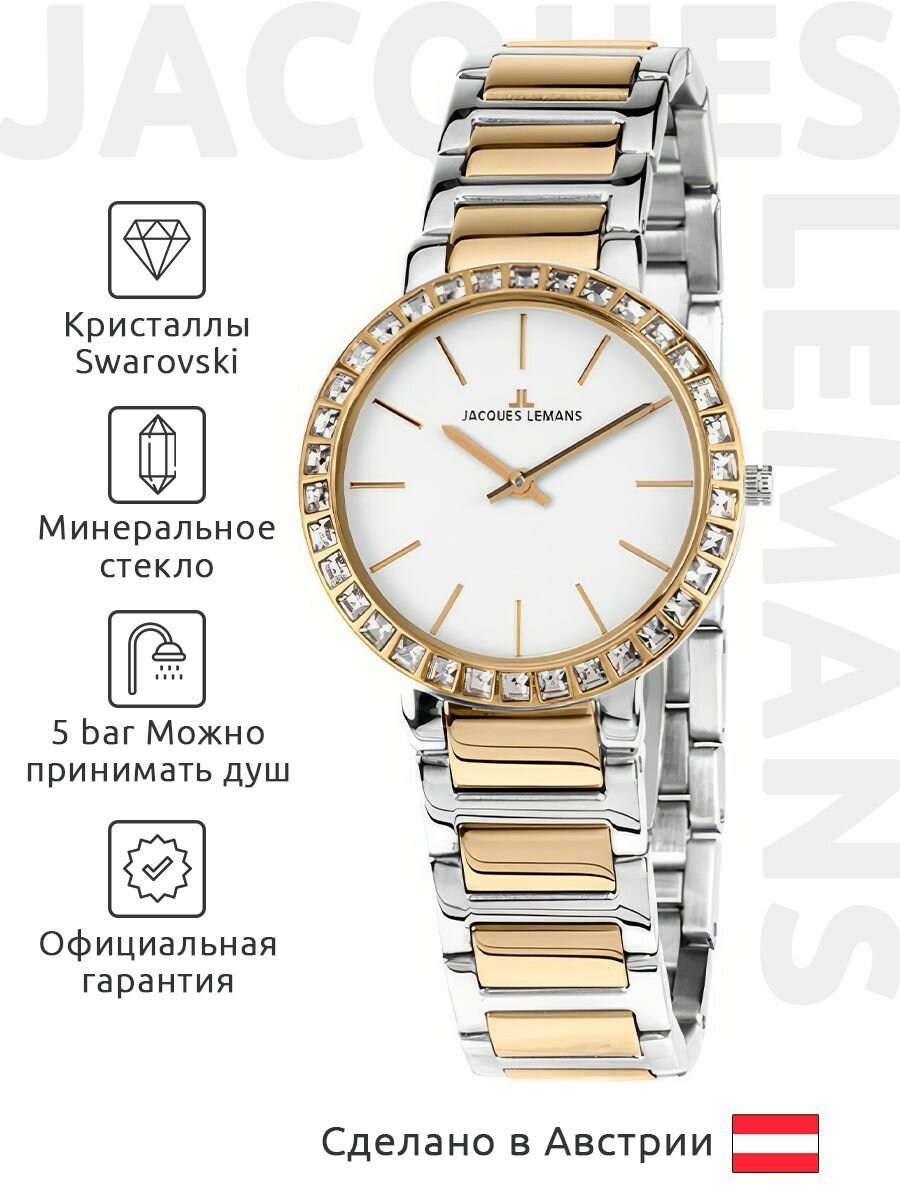 Купить Наручные часы Jacques Lemans 1-1843D, женские кварцевые классические часы Жак Леман с кристаллами Swarovski на стальном браслете