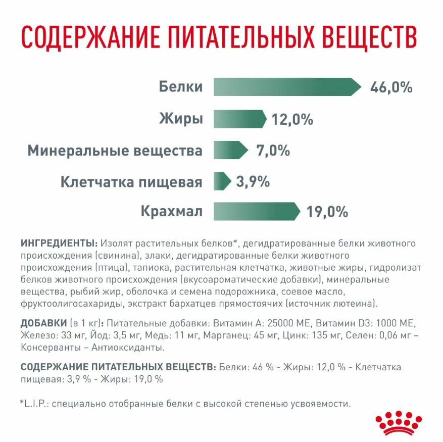 | Состав | дегидратированные белки животного происхождения (птица), ячмень, пшеничная клейковина, кукурузная клейковина, тапиока, изолят белка сои, животные жиры, гидролизат белков животного происхождения, растительная клетчатка, экстракт цикория, рыбий жир, оболочка и семена подорожника, минеральные вещества, фруктоолигосахариды, соевое масло, экстракт бархатцев прямостоячих |