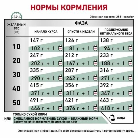 | Дополнительная информация | 1. Эффективный контроль массы тела Способствует безопасному снижению веса и уменьшает риск его повторного набора. У 97%* собак вес снизился в течение трех месяцев. *Для собак весом менее 10 кг рекомендуется продукт Satiety Small Dog 2. Контроль выпрашивания Высокое содержание клетчатки позволяет собакам сохранять чувство сытости между кормлениями. Помогает контролировать выпрашивание корма у 83% собак в период снижения веса 3. Поддержание мышечной массы Повышенное содержание белка помогает поддерживать мышечную массу в процессе снижения веса. |