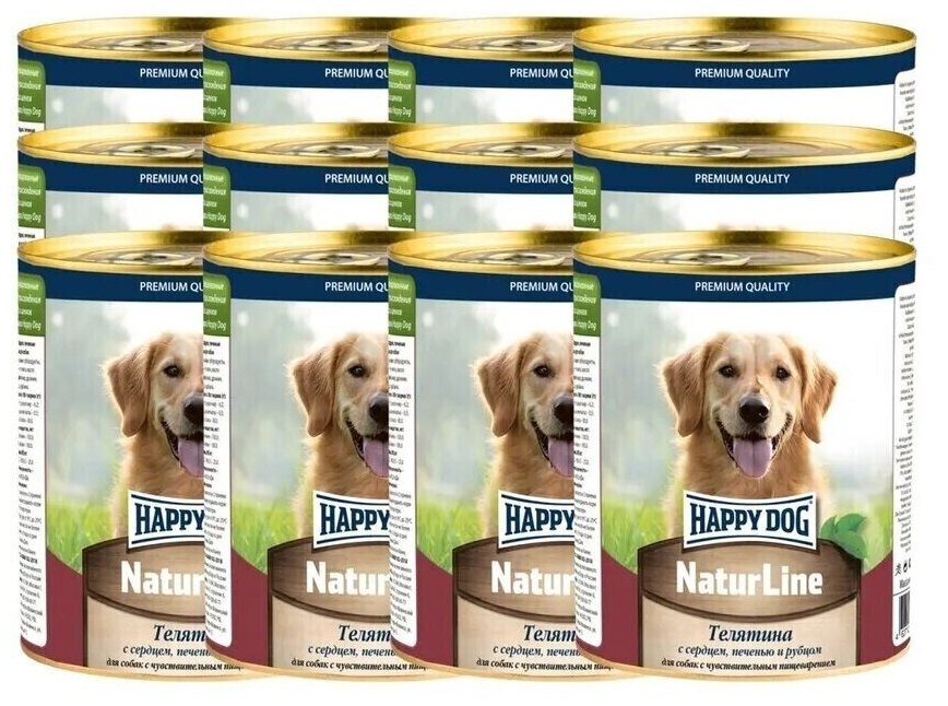 Влажный корм для собак Happy Dog NaturLine, телятина, сердце, печень, рубец 12 шт. х 970 г