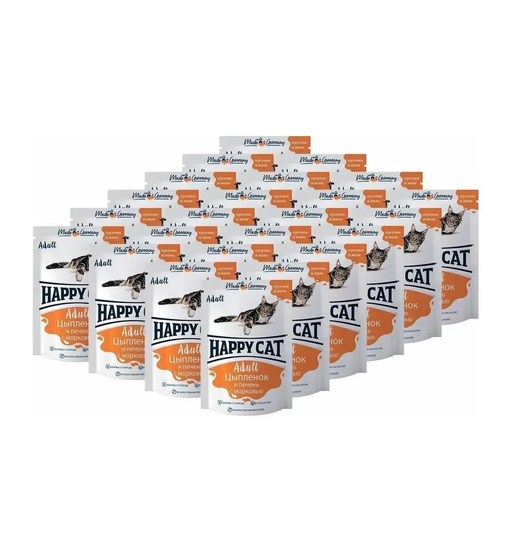 Купить Влажный корм Happy Cat для кошек любых пород, цыпленок и печень с морковью, кусочки в желе 24шт х 85г