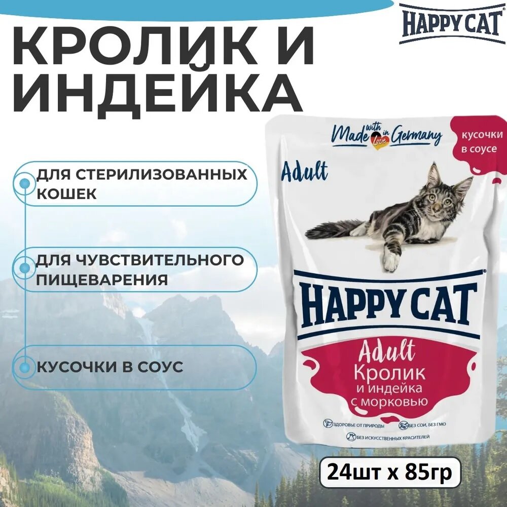 Купить Паучи Happy Cat Корм для кошек, кусочки в соусе кролик и индейка с морковью» 85 гр х 24шт