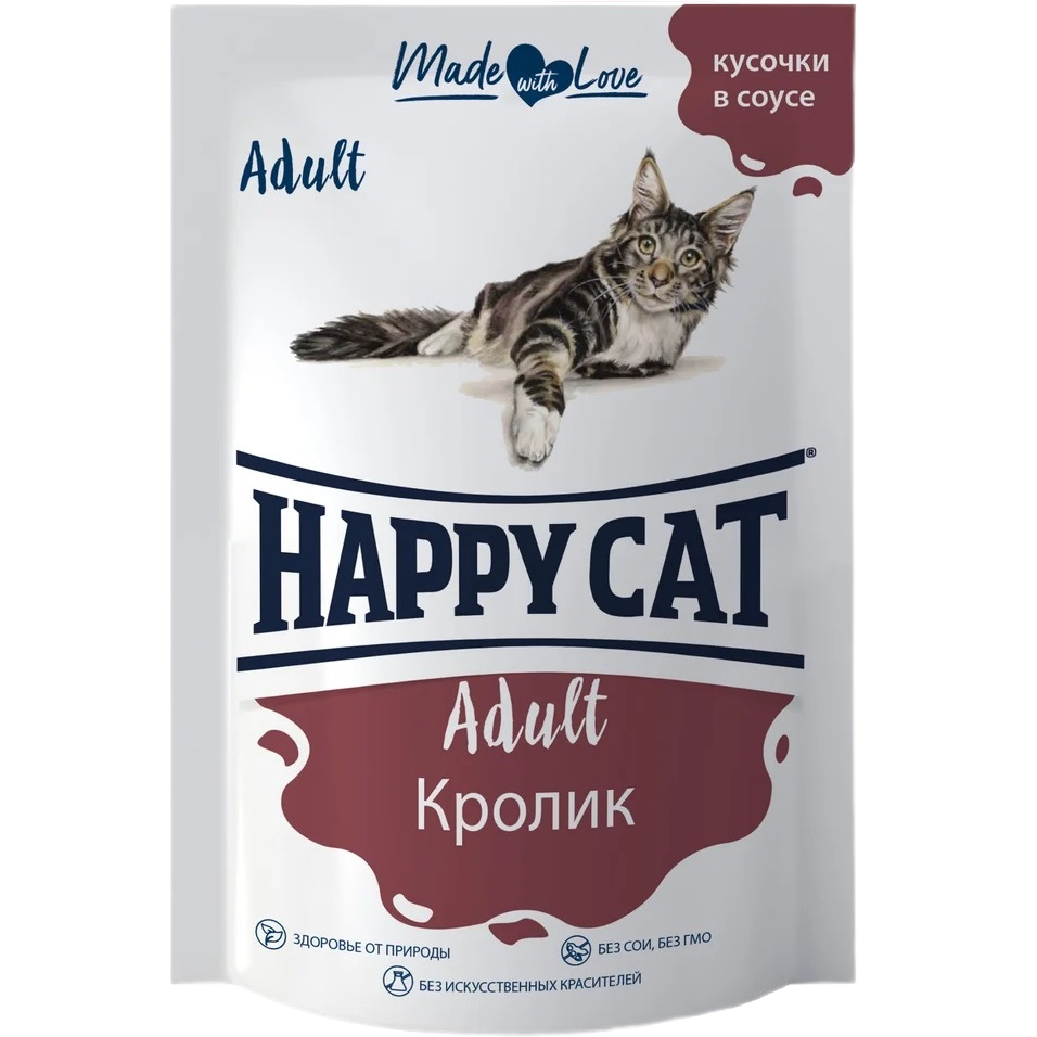 Happy Cat паучи для взрослых кошек, с кроликом, кусочки в соусе - 85 г х 24 шт