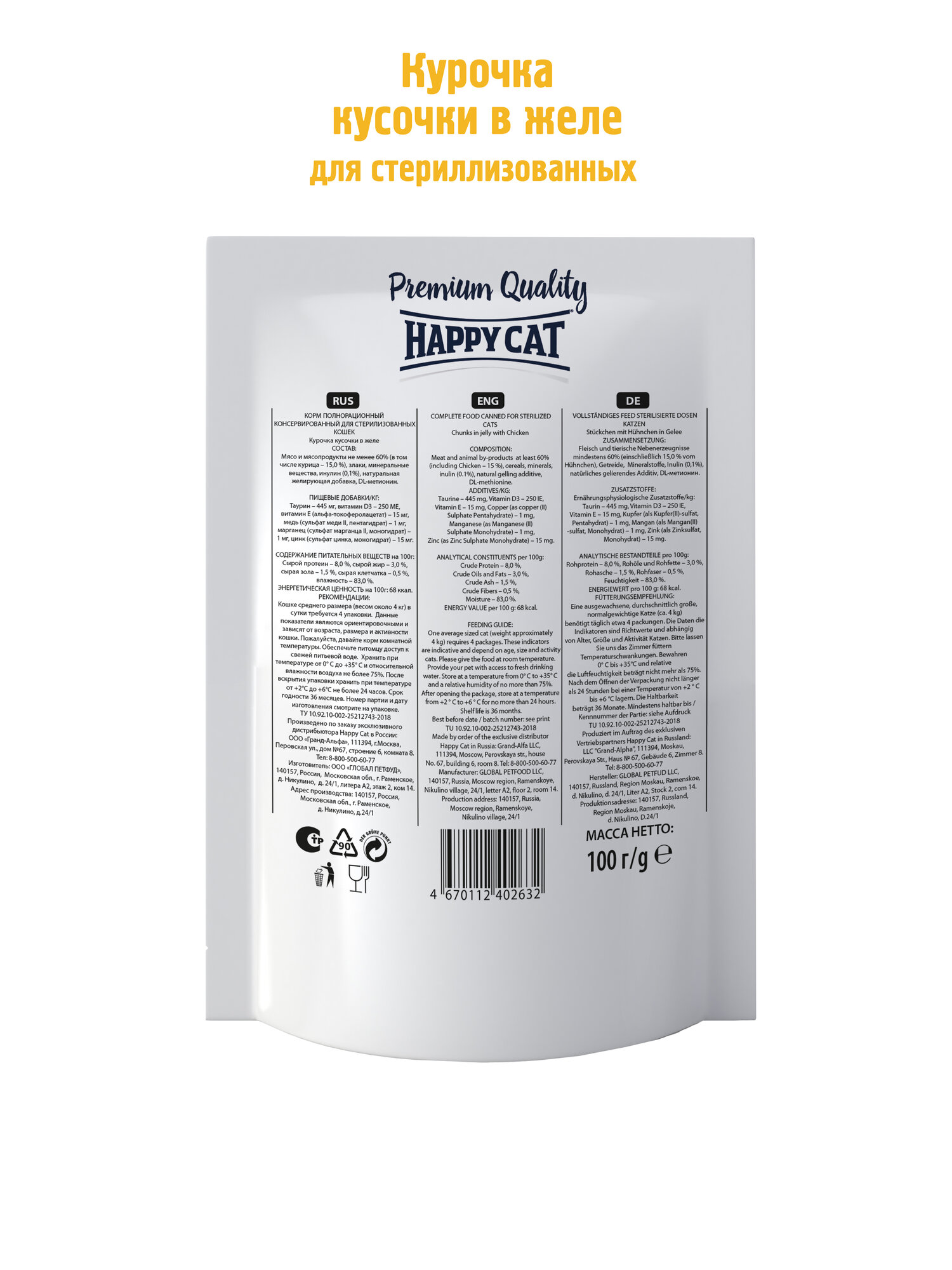 Happy Cat паучи для взрослых стерилизованных кошек и кастрированных котов, с курочкой, кусочки в желе - 85 г