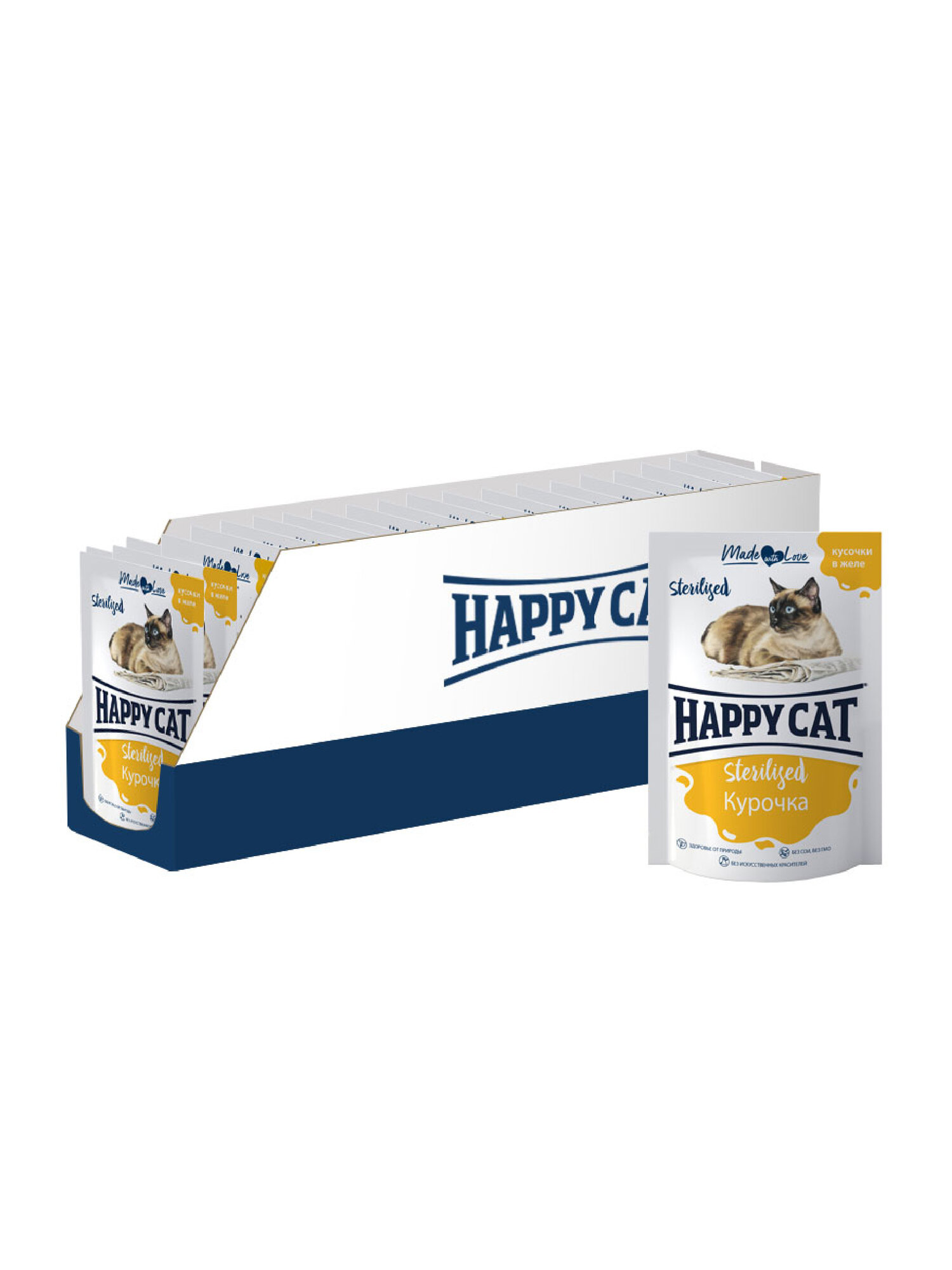 Happy Cat паучи для взрослых стерилизованных кошек и кастрированных котов, с курочкой, кусочки в желе - 85 г х 24 шт