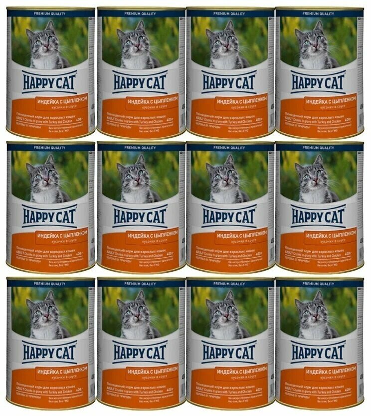 Happy Cat консервы для взрослых кошек с индейкой и цыпленком в соусе - 400 г х 12 шт (Россия)