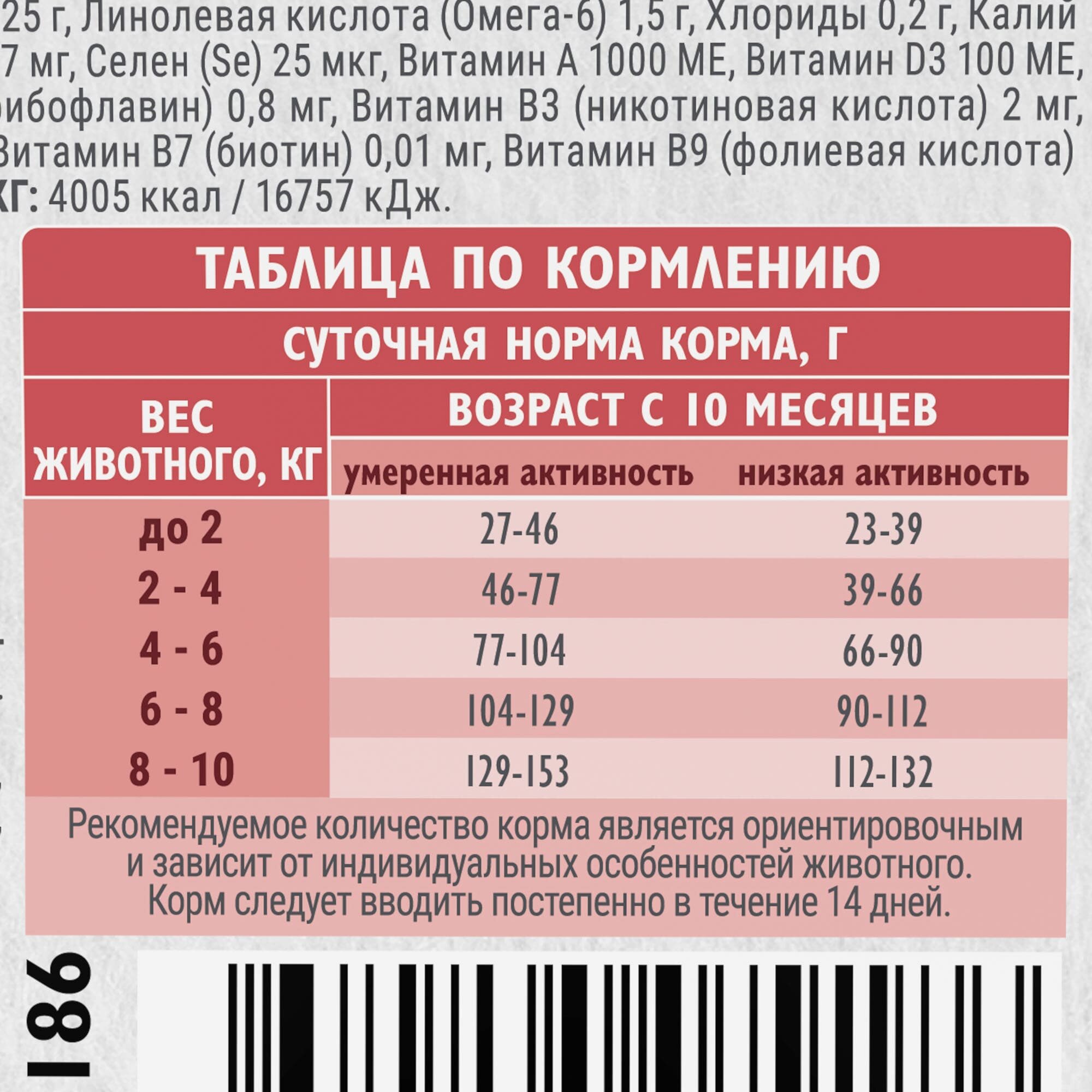 | Дозировка | - вес собаки 10 кг - 112 г - вес собаки 15 кг - 152 г - вес собаки 20 кг - 189 г - вес собаки 25 кг - 223 г |