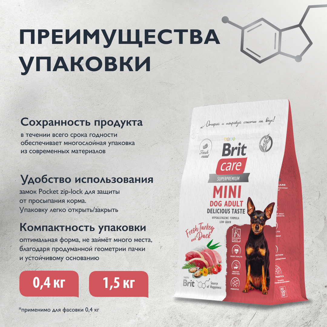 BRIT CARE MINI DOG ADULT DELICIOUS TASTE для привер взрослых собак малень пор индейка утка 0,4 кг