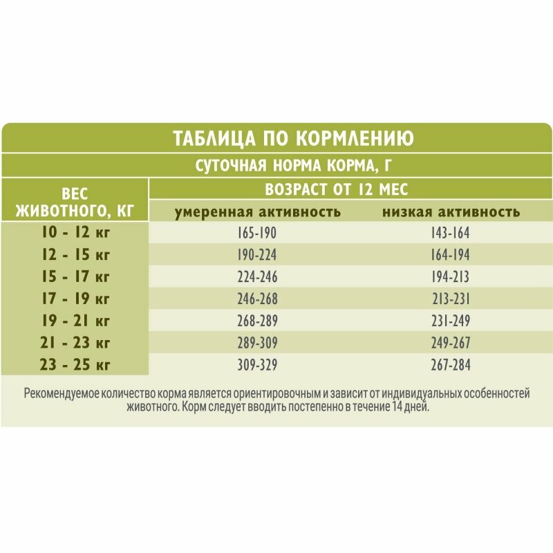 | Дозировка | - вес собаки 10 кг - 112 г - вес собаки 15 кг - 152 г - вес собаки 20 кг - 189 г - вес собаки 25 кг - 223 г |
