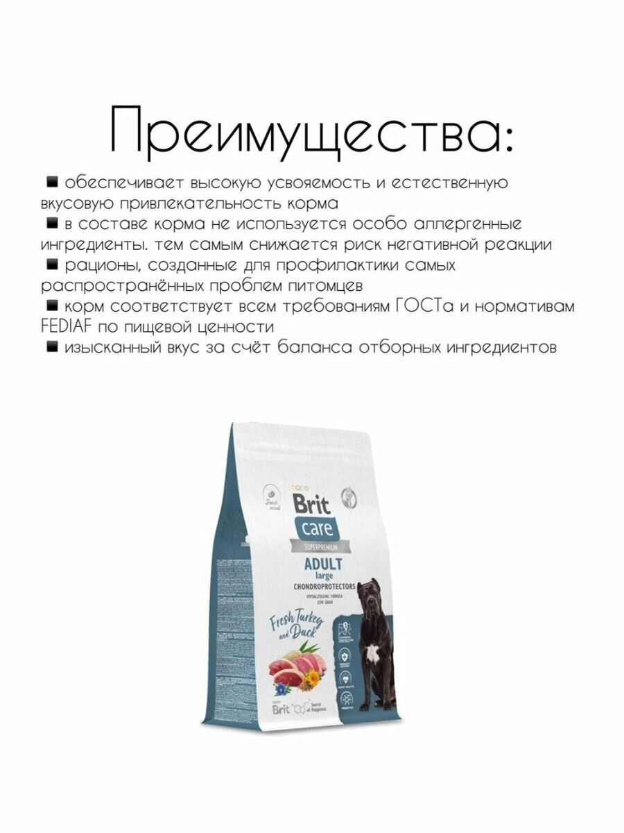 Сухой корм для взрослых собак крупных пород супер-премиум с индейкой и уткой "Dog Adult Large Chondroprotectors" 12 кг BRIT CARE