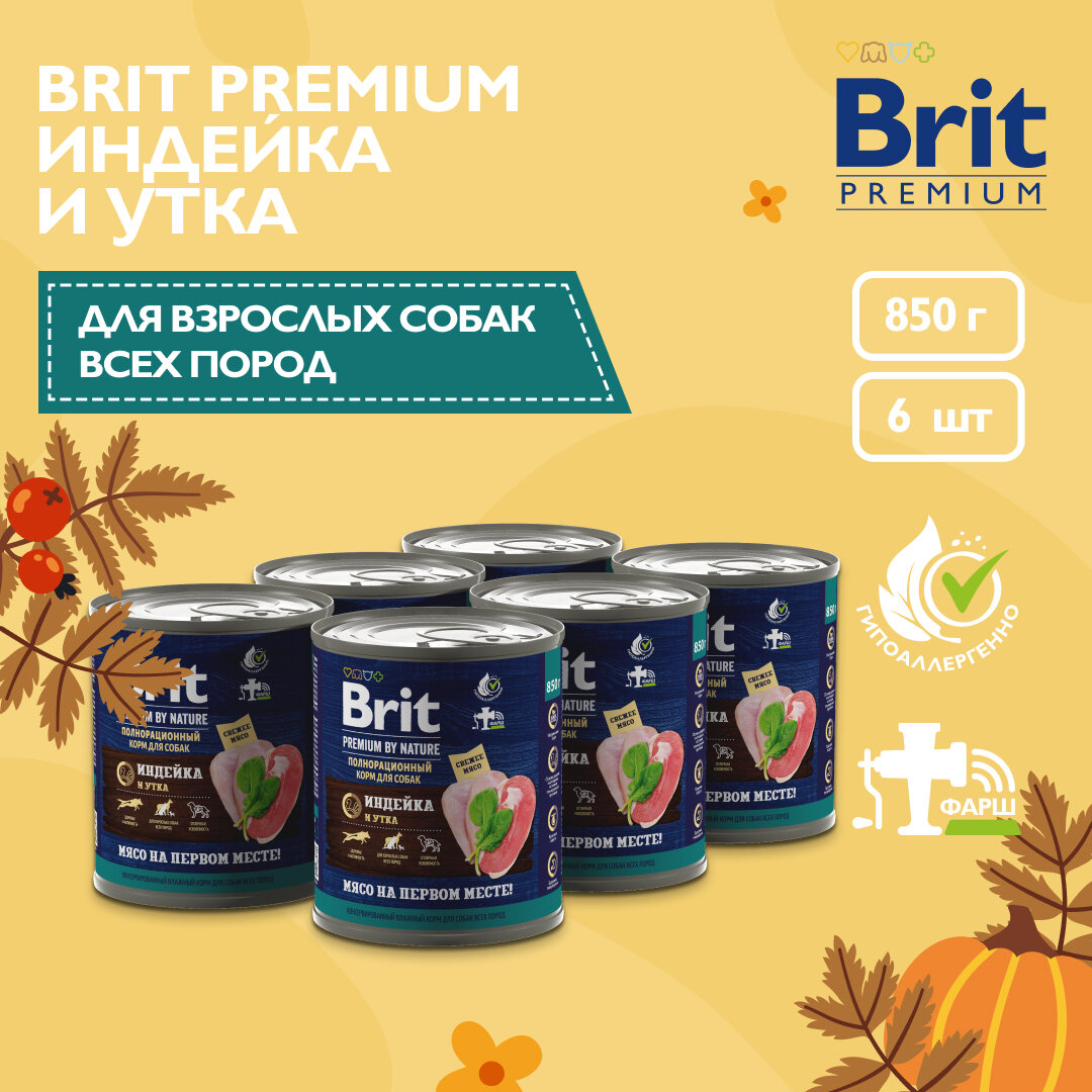Brit Premium by Nature консервы для взрослых собак всех пород с индейкой и уткой - 850 г х 6 шт