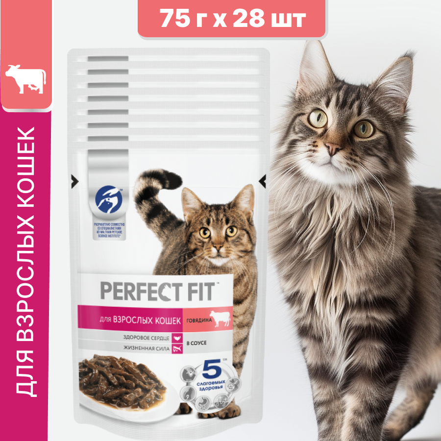 Купить Влажный полнорационный корм PERFECT FIT для взрослых кошек, с говядиной в соусе, 28 шт по 75 г
