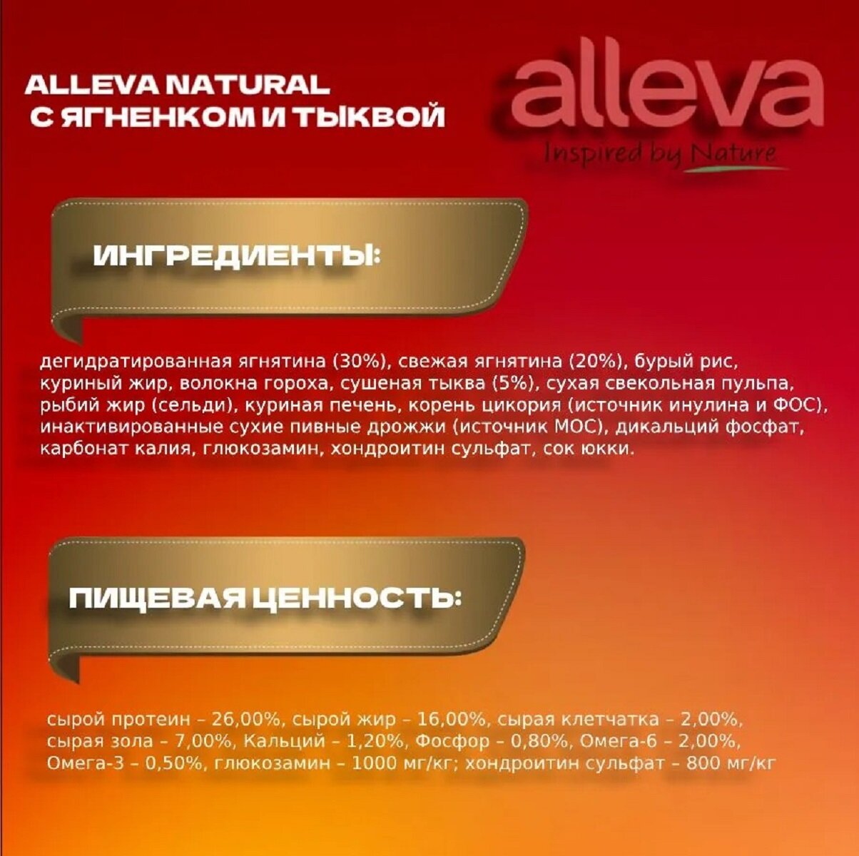 | Состав | дегидратированная ягнятина (30%), свежая ягнятина (20%), бурый рис, куриный жир, волокна гороха, сушеная тыква (5%), сухая свекольная пульпа, рыбий жир, куриная печень, корень цикория (источник инулина и ФОС), инактивированные сухие пивные дрожжи (источник МОС), дикальций фосфат, карбонат калия, глюкозамин, хондроитин сульфат, сок юкки |