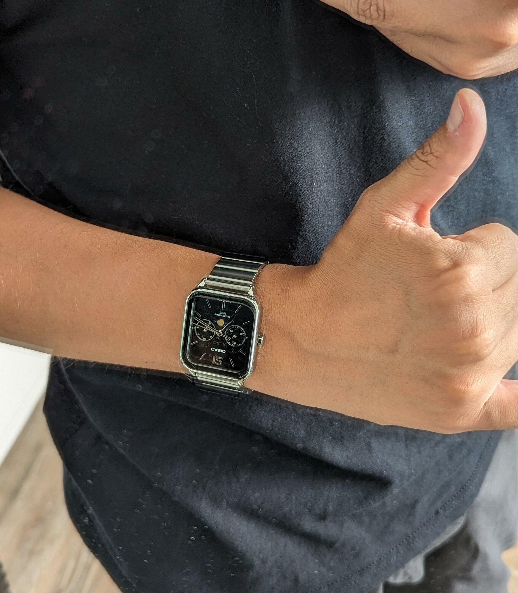| Плюсы: | Белый цвет корпуса, большой хорошо читаемый стрелочный циферблат. Флуоресцентная подсветка стрелок. Водозащита WR100. 5 будильников, удобно, если надо что-то делать по расписанию несколько раз в день.