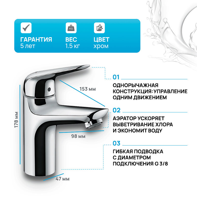 Novus, смеситель для умывальника, неповоротный излив, с донным клапаном, 100 мм, со сливным гарнитуром, арт. 71030000, Hansgrohe