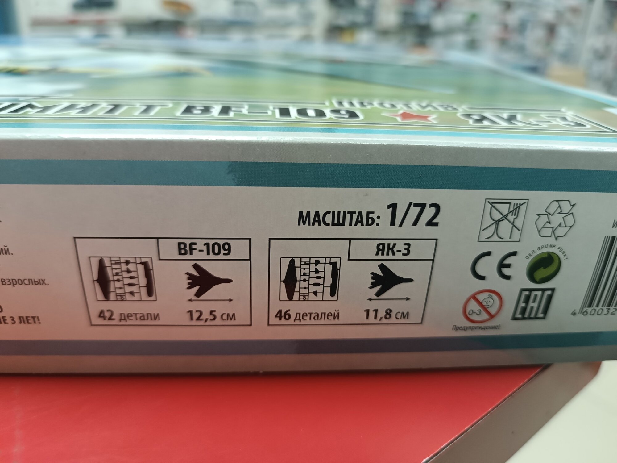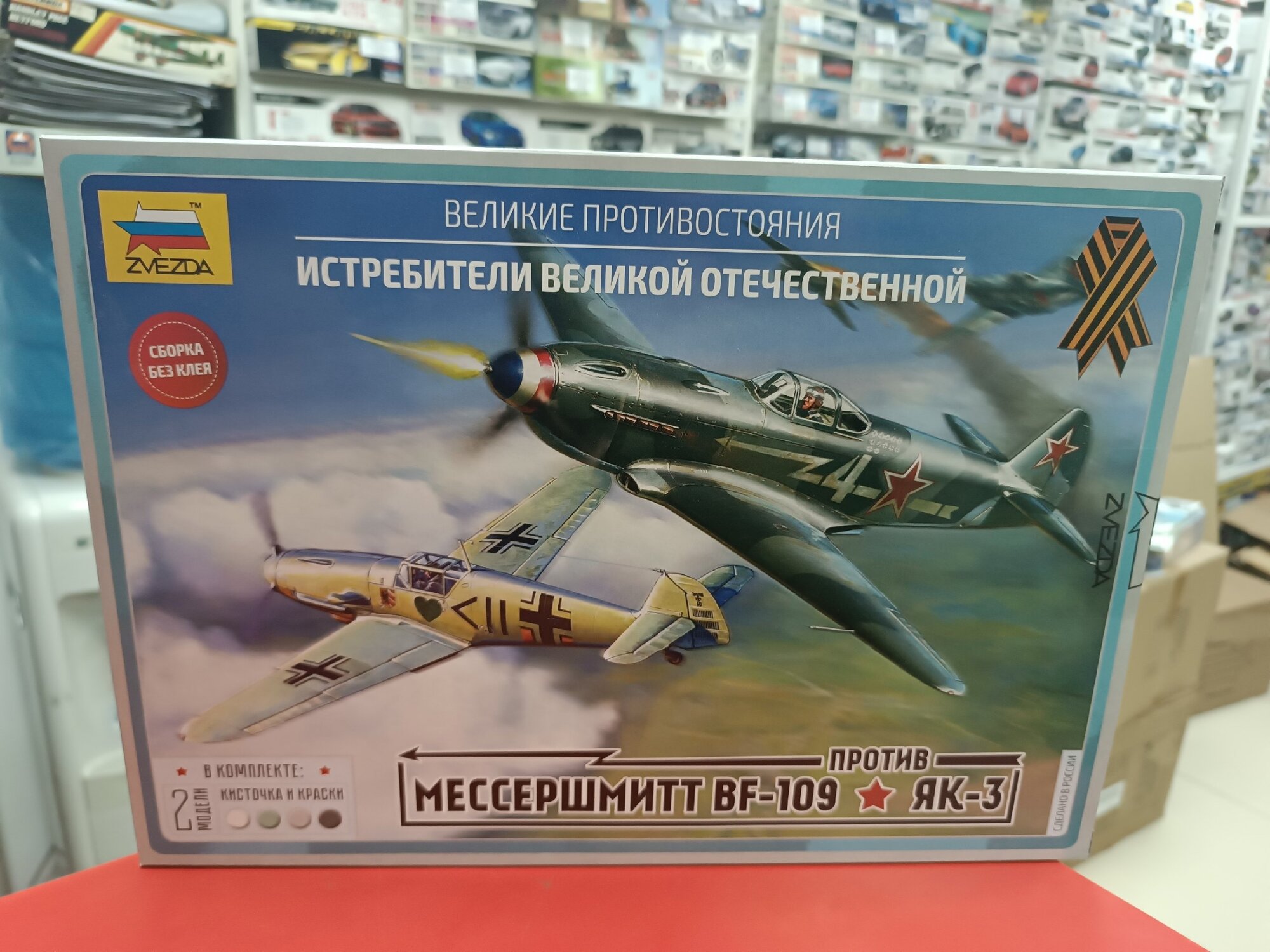 | Комплектация | сборная модель истребителя Мессершмитт BF - 109 / состоящая из 42 деталей в масштабе 1/72; сборная модель истребителя Як - 3 / состоящая из 46 деталей в масштабе 1/72; кисточка и краски (4 цвета); инструкция по сборке; красочная брошюра с интересными фактами об истории создания и боевом применении данных истребителей |