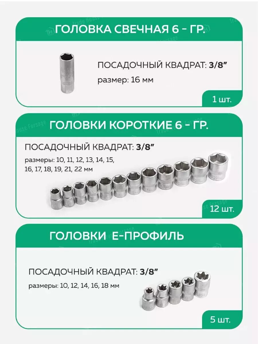 | Головки торцевые подробно | 1/2": 14, 15, 16, 17, 18, 19, 20, 22, 24, 27, 30, 32 мм; свечные 1/2": 16, 21 мм; 1/4": 4, 4.5, 5, 5.5, 6, 7, 8, 9, 10, 11, 12, 13, 14 мм; с битами 1/4": H3, H4, H5, H6, T8, T10, T15, T20, T25, T30, SL4, SL5.5, SL7, PH1, PH2, PZ1, PZ2; адаптер 3/8"(F)x1/2"(M); трещотка 1/2"; карданный шарнир 1/2"; удлинитель 1/2": 125, 250 мм; удлинитель 1/4": 50, 100 мм; гибкий удлинитель 1/4"; карданный шарнир 1/4"; трещотка 1/4"; держатель биты 1/2"x5/16" |