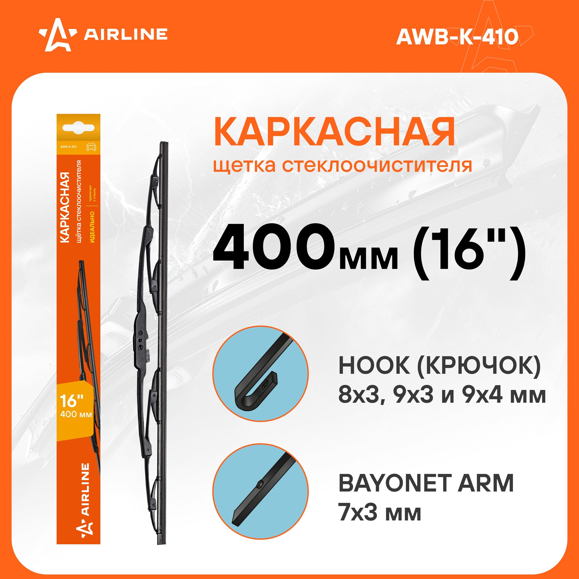 Купить Щетка стеклоочистителя 400 мм (16") каркасная, 2 адаптера AWB-K-410 AIRLINE