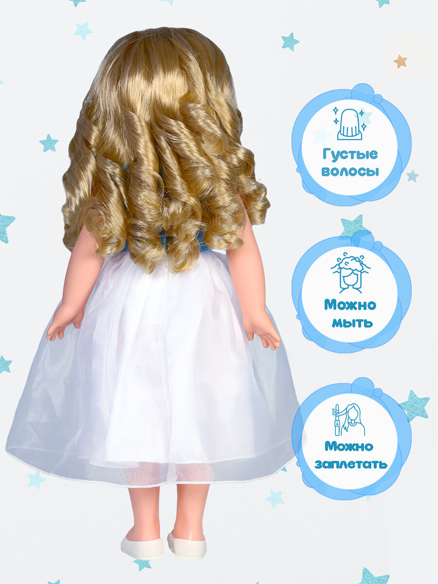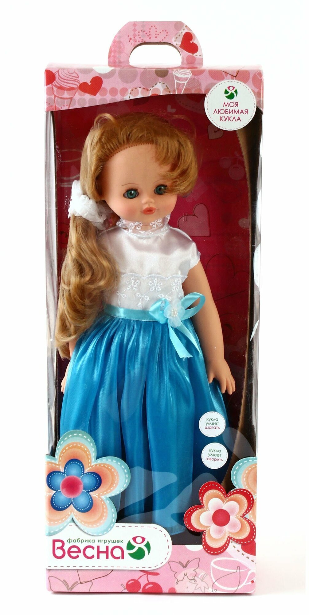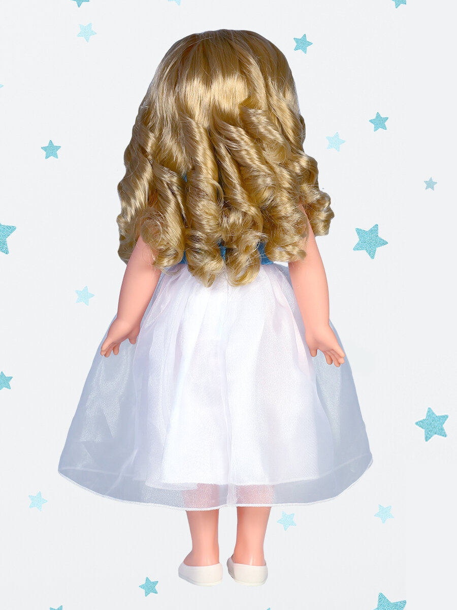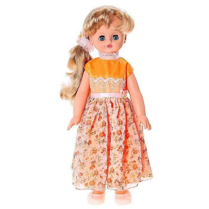 | Дополнительная информация | в комплект одежды куклы входит: платье, резинка для волос, туфли; материал платья: шёлк и органза с отделкой из капронового кружева, резинка: капроновоя лента; во избежание поломки механизма движения куклы её не рекомендуется усаживать |