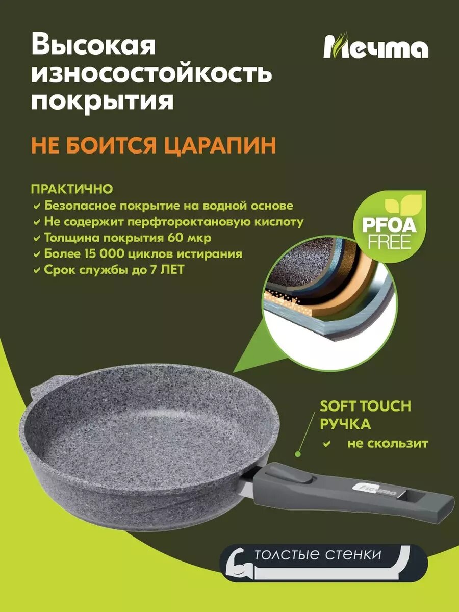 Сковорода Мечта 22 см Премиум с антипригарным покрытием со съемной ручкой, НЕ индукционная