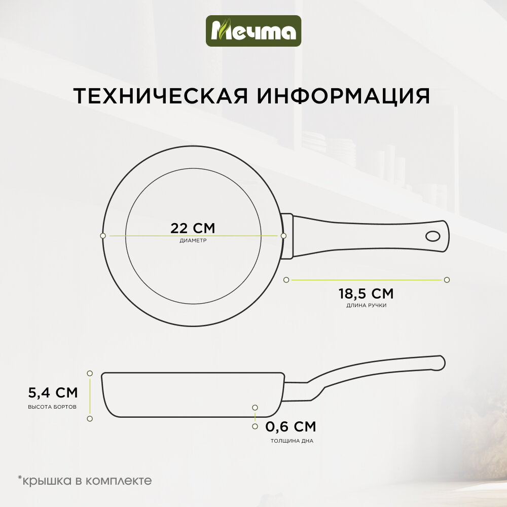 Сковорода Мечта 22см Премиум с антипригарным покрытием со съемной ручкой и крышкой с022901