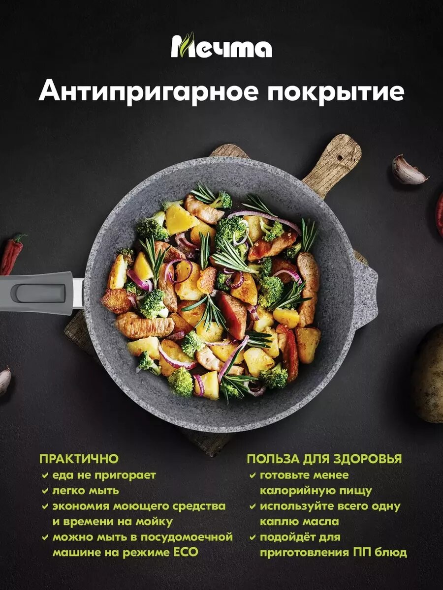 Сковорода Мечта 22 см Премиум с антипригарным покрытием со съемной ручкой, НЕ индукционная