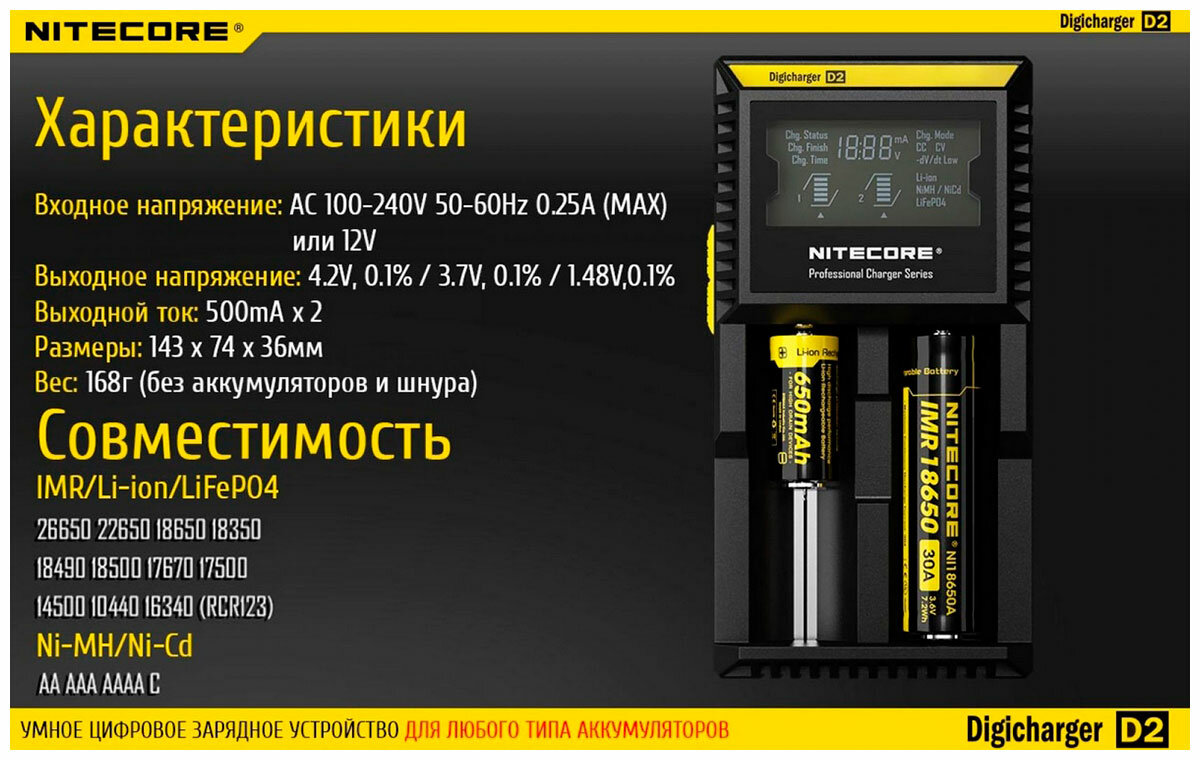 Зарядное устройство NITECORE D2 18650/16340 на 2*АКБ Intellicharge V2, совместим с Li-ion и Ni-MH/Ni-Cd аккумуляторами, с автоматическим определением