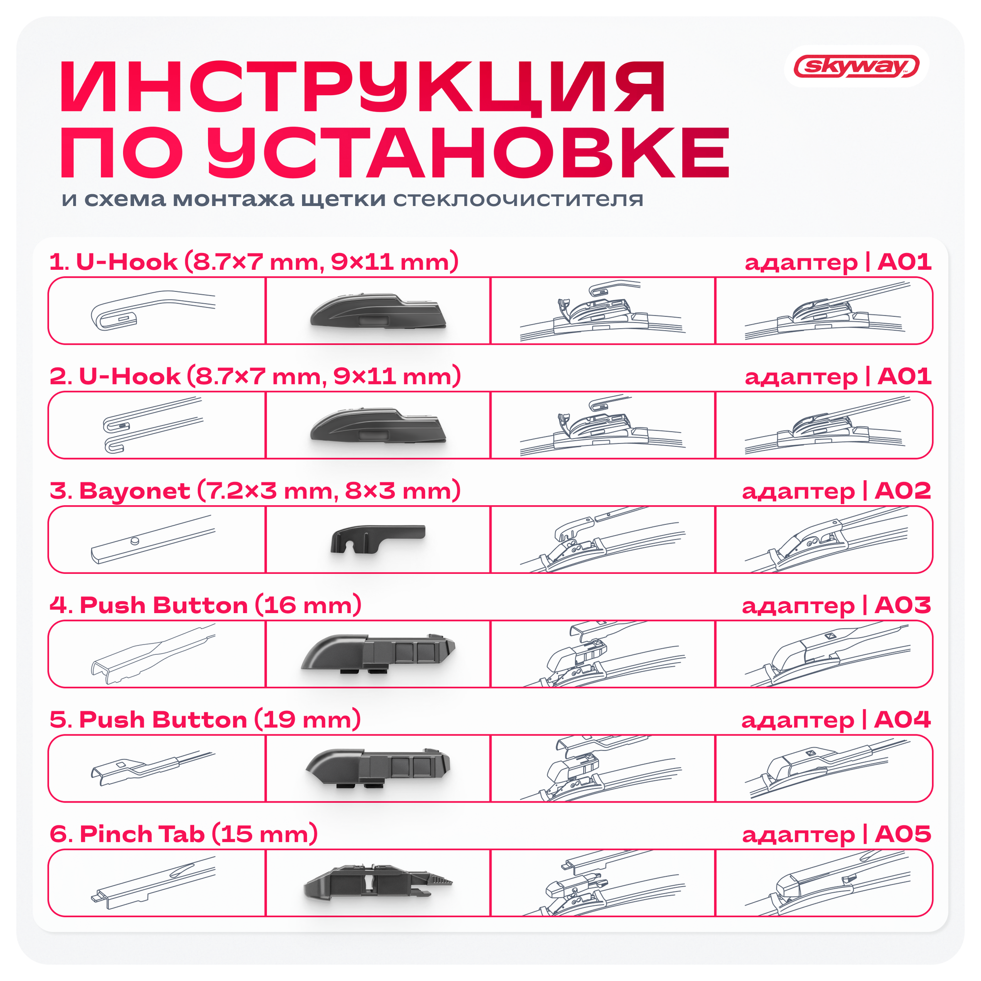 | Дополнительная информация | Установка: Подберите необходимый Вам адаптер. Возьмите дворник пальцами с обеих сторон. Подведите дворник так, чтобы крюк упёрся в верхний край крепления. Надавите на крюк так, чтобы он провалился в крепление. Потяните дворник в сторону от крюка, пока он не защёлкнется. Закройте крышку крепления. Внимание: чтобы не препятствовать установке дворника, держите его снизу за лезвие. |