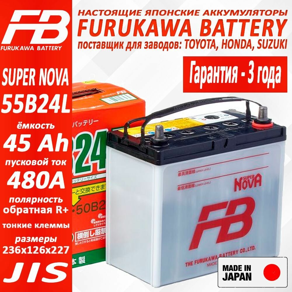 FURUKAWA BATTERY Аккумулятор FB SUPER NOVA 55B24L ёмкость 45 Ah, пусковой ток 480 А, 236x126x227 Обратная полярность