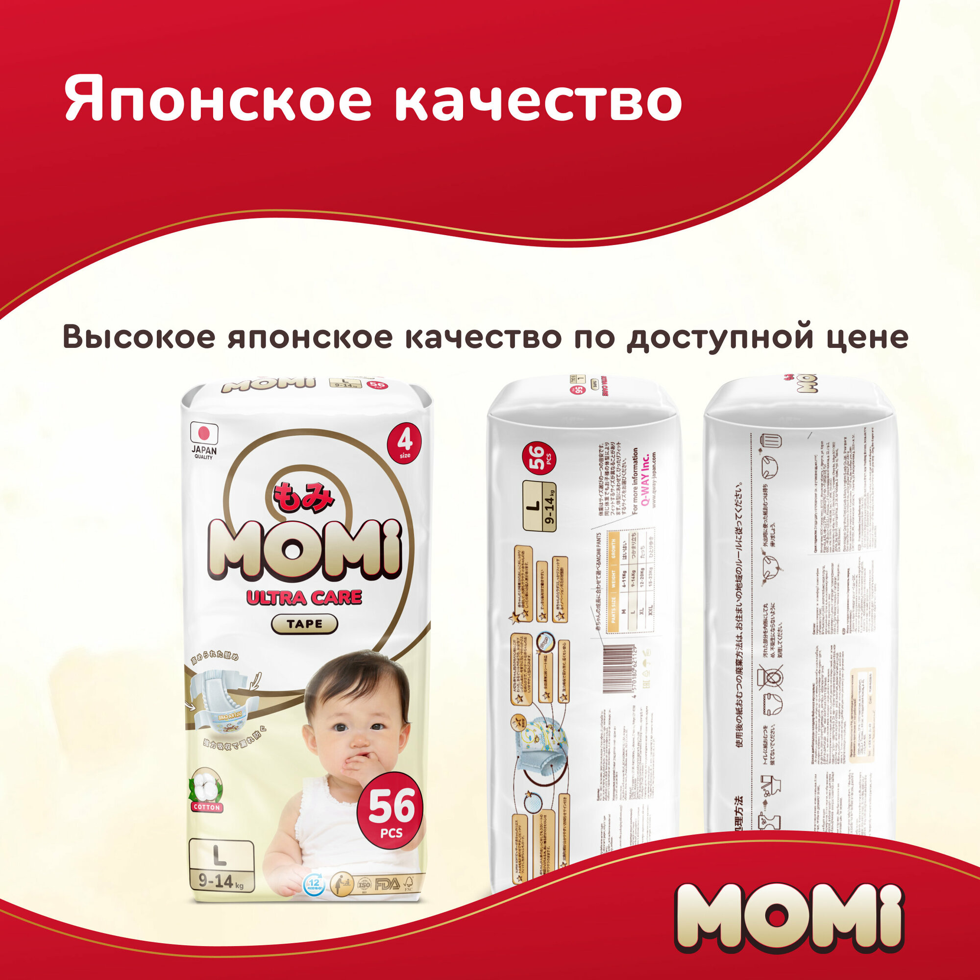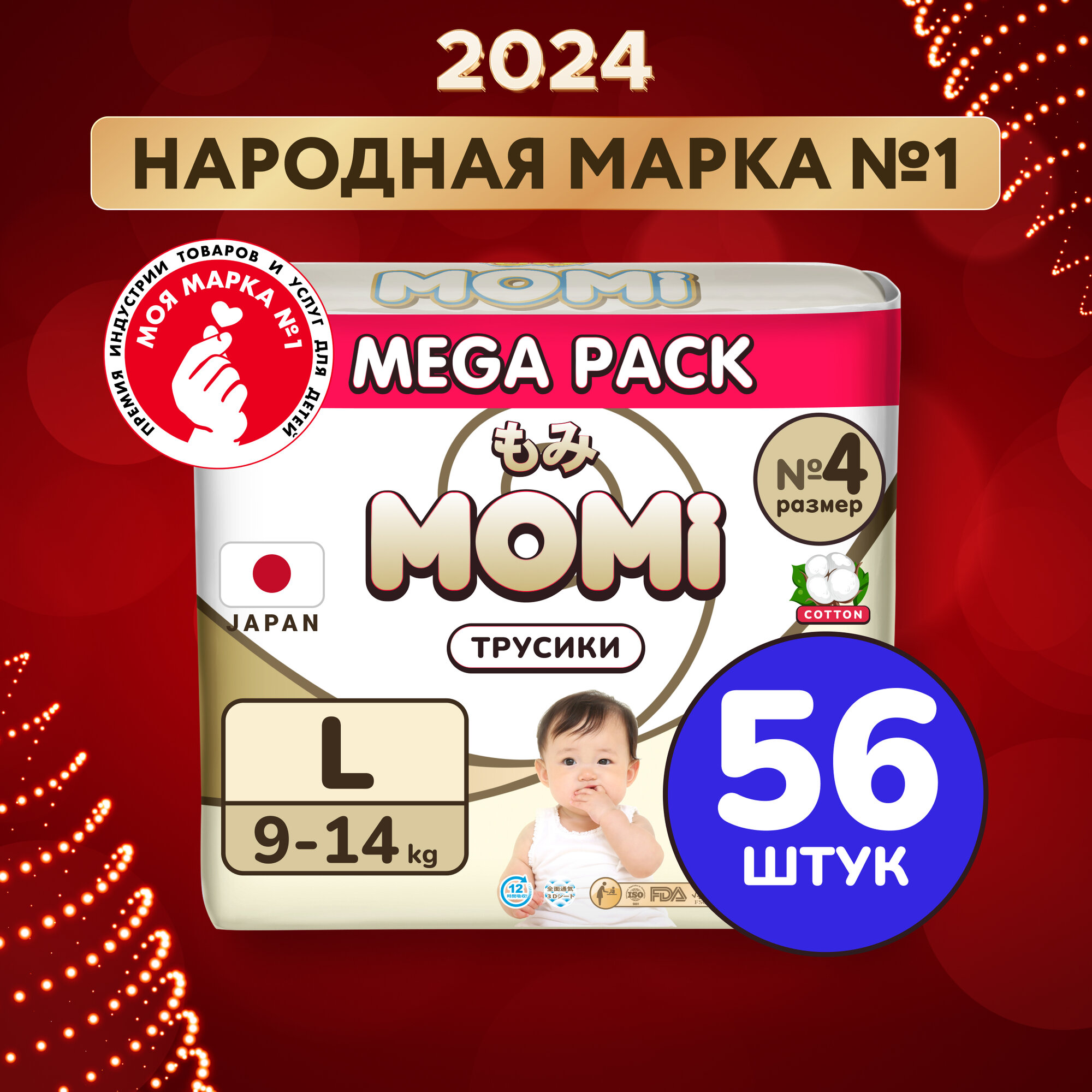 Подгузники-трусики Momi MEGA PACK ULTRA CARE L (9-14 кг). 56 шт