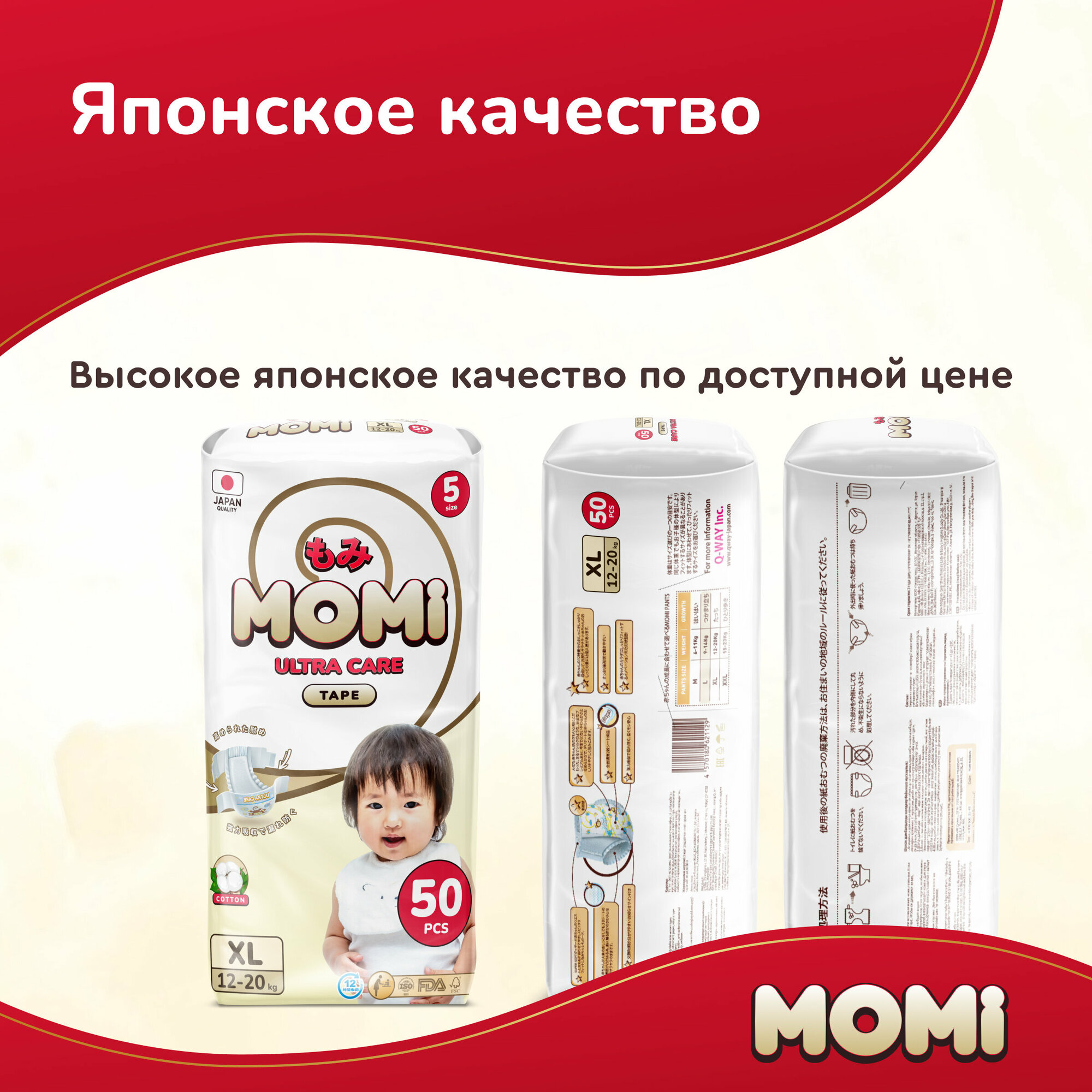 Подгузники-трусики Momi MEGA PACK ULTRA CARE XL (12-20 кг). 50 шт